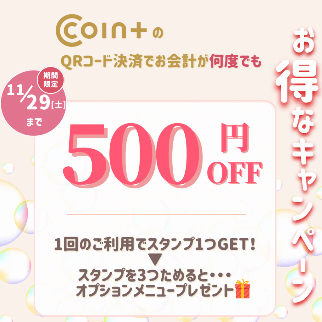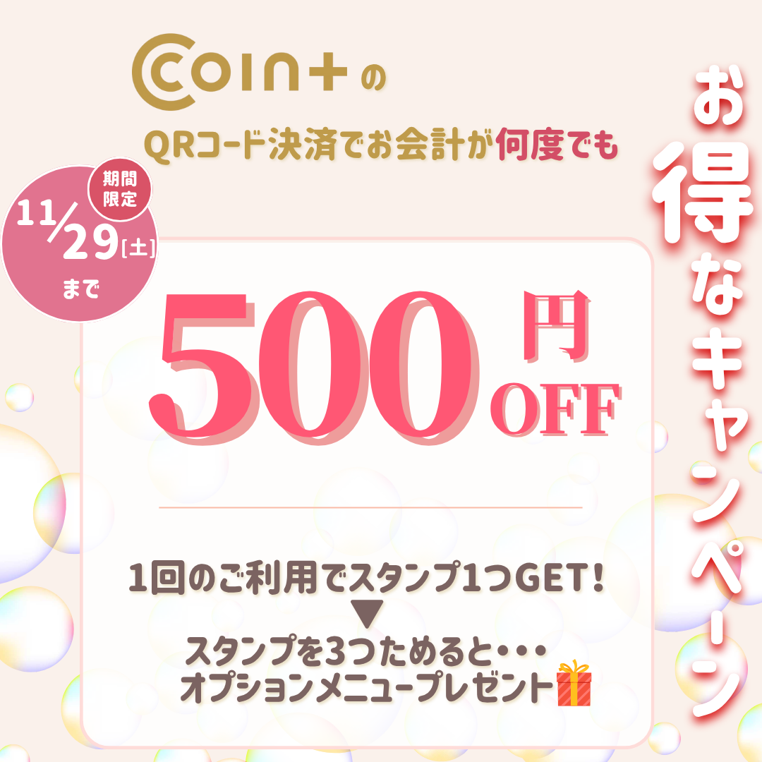 【キャンペーン情報】coin+QRコード決済でお会計が何度でも500円OFFキャンペーン実施中です。
